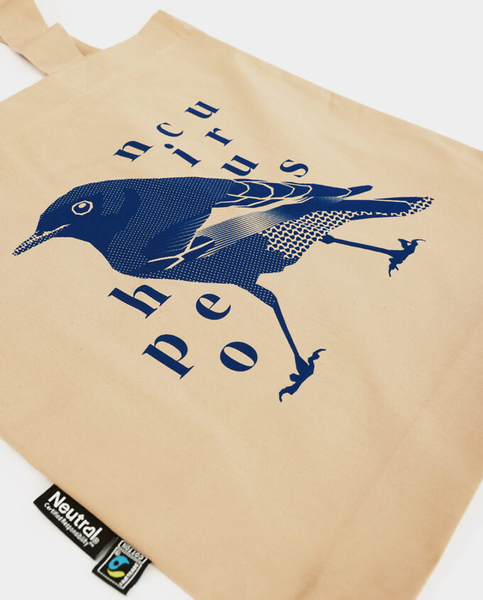 Taška s motivem lindušky luční, potištěná sítotiskem.